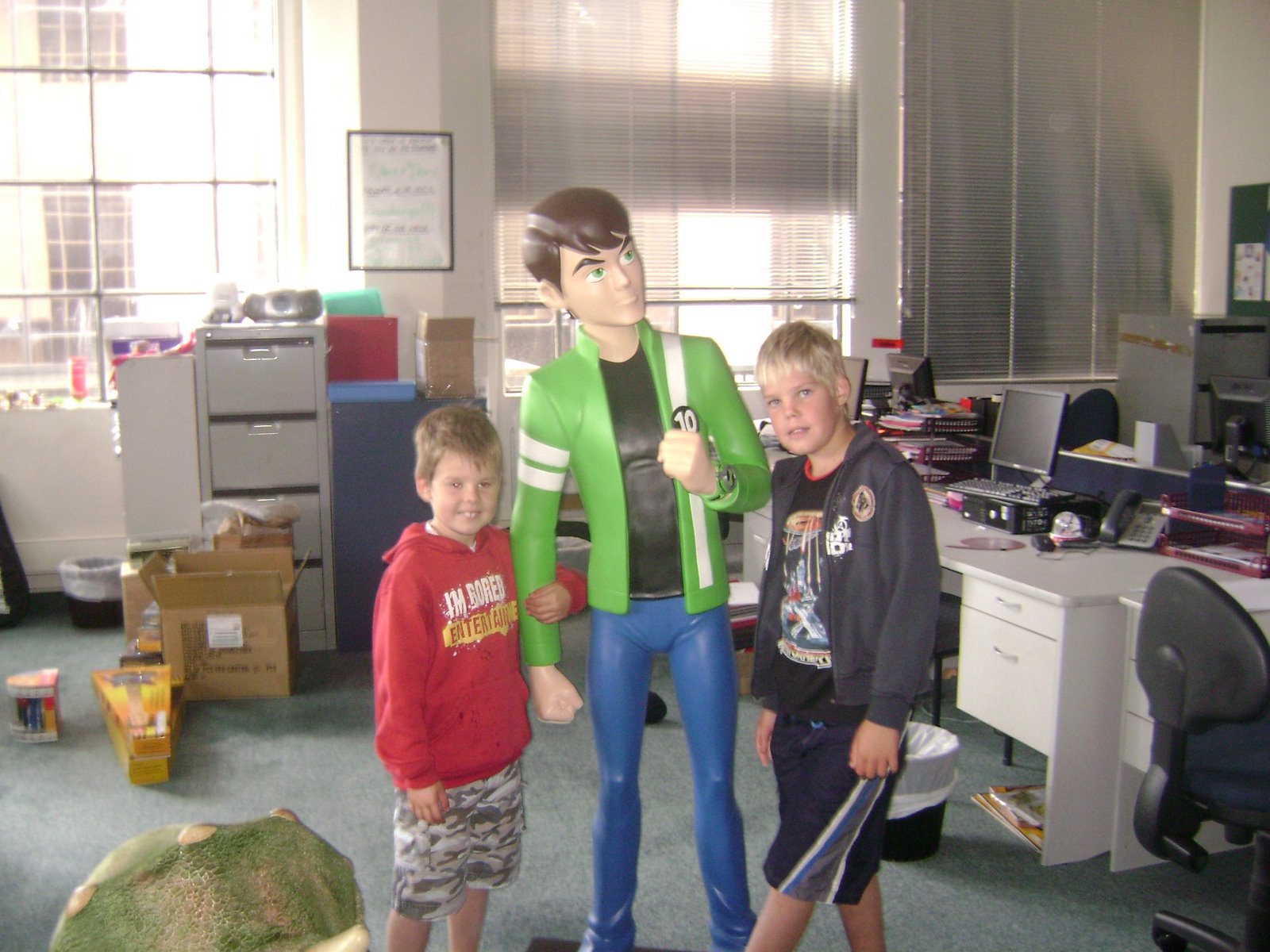 * feed the ducks at Western Springs (done, and there were heaps of eels too. Even crawling over the rocks under the double arch bridge – gross) * take the boys into work for a photo with Ben 10 (done, they thought it very cool and wanted to bring him home. Ah, no!)