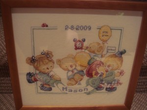 This is Mason’s – Sharon made it from a Maria van Scharrenburg kit. I had to finish off the bottom border but didn’t touch it otherwise.