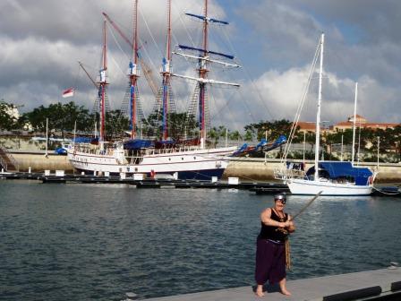 And recieved an update from Jill. Back on the boat, making me jealous! And still dedicated to the Pirate Gag. Apparently the sword is an antique Iban head hunting sword (which runs me off into GoogleWorld). Awesome. I’d have that white one behind her (no, the BIG one). Bet I could get volunteers to crew it without too much hassle!