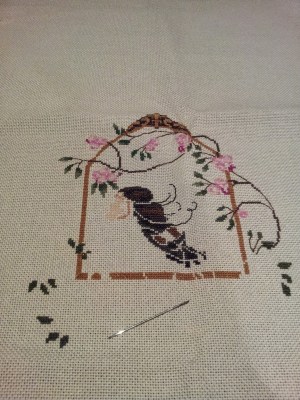 - started Nora Corbett’s Arezzo, setting the bar high in making this my first colour conversion (hate the dress colour and the lilac roses, and have made the leaves darker) and my first “over 1”, meaning over the one thread not the usual two. Squintville, here I come. Not sure if this is truly an NC or a Mirabilia design, but it’s pretty and delicate.