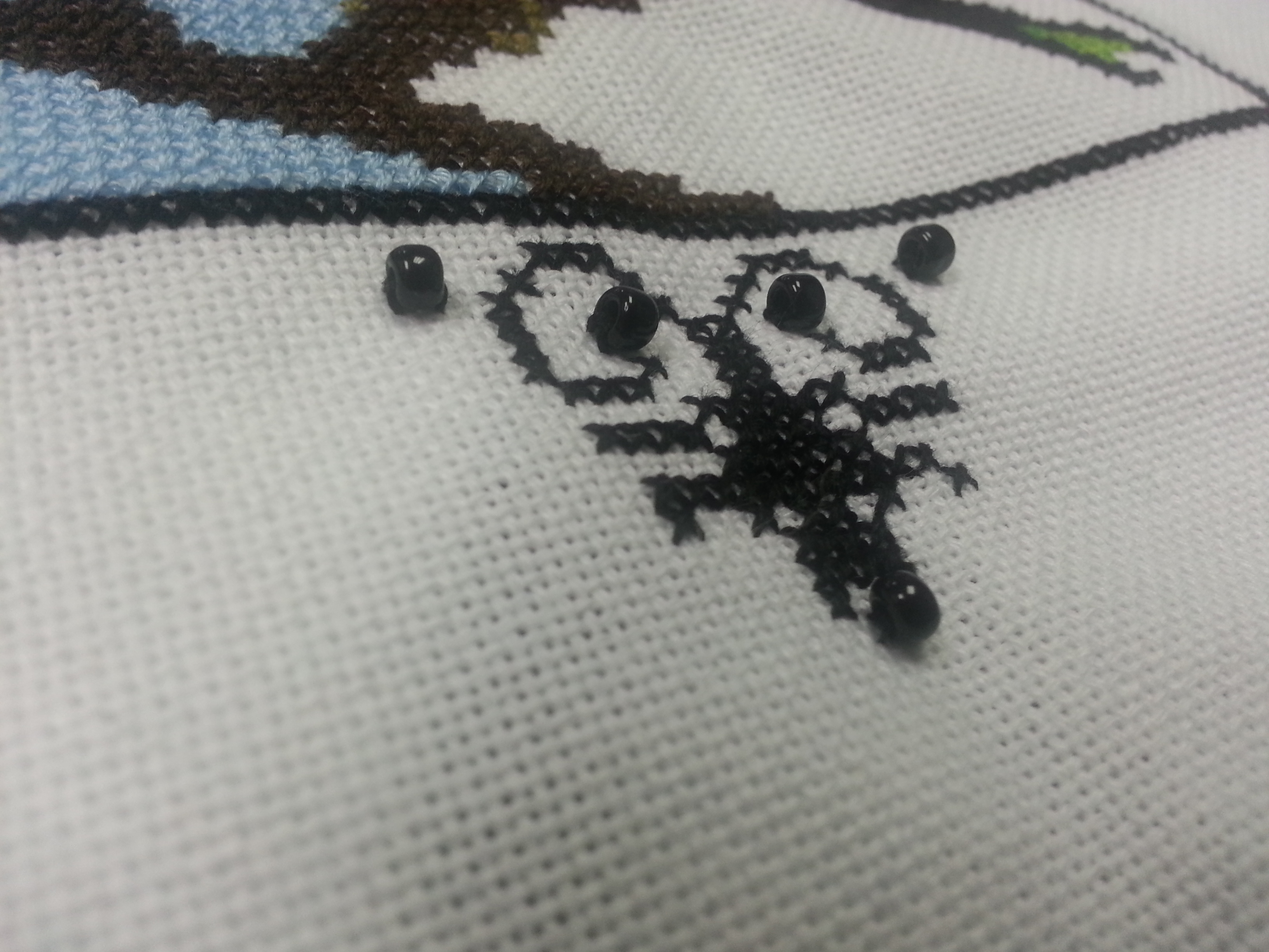 Close-up of the beads; this is a design where I prefer to stitch the beads with a full cross as they are so large. Actually I do this on most pieces as I think this makes them more secure, and I like to see them vertically rather than on a lean. Also very important is to NOT carry the darker threads under a light coloured fabric. If you are a new stitcher, remember that you can flip your fabric 180 degrees and your crosses will still go in the same direction! And if you are stitching massive blocks of background, either buy that thread ensuring it’s from the same dye batch or stitch that block using one thread from each skein to get a blend.