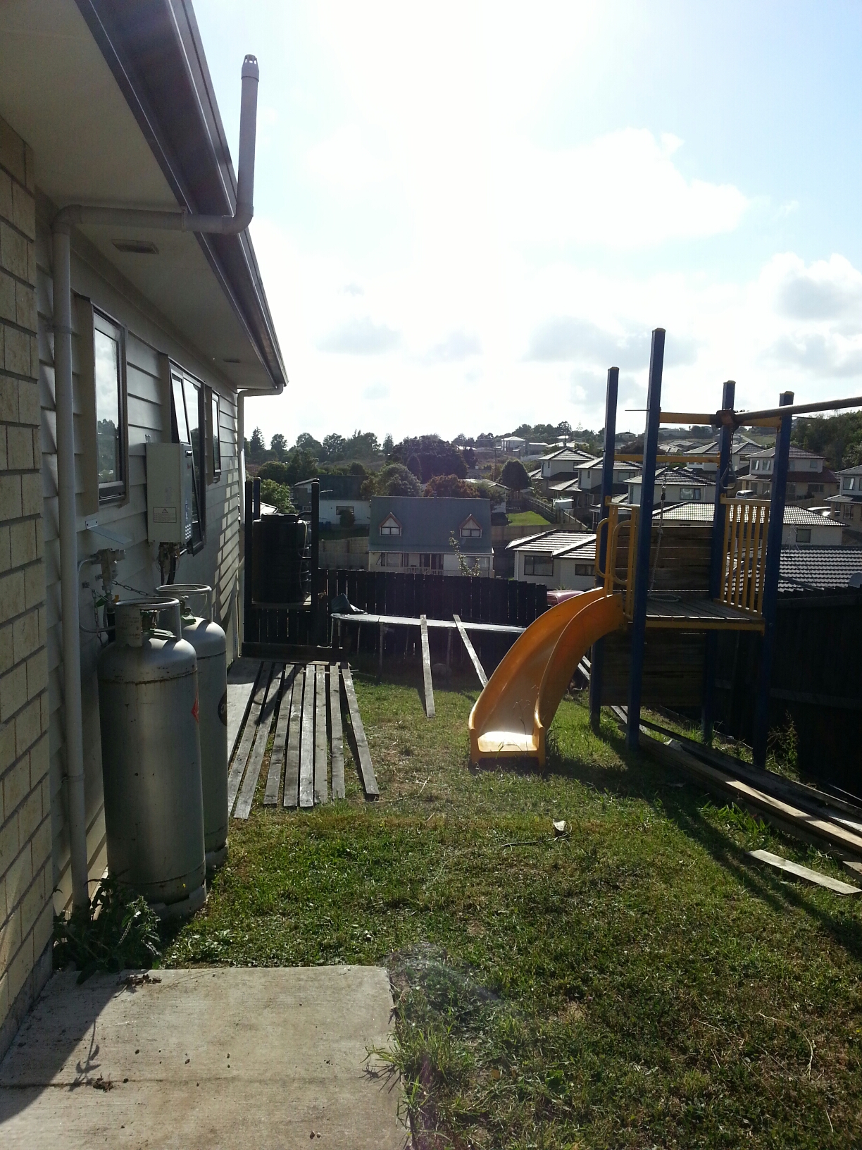 We are motoring along with the back yard, now that Si is better. The fence panels are getting to second coat, the playground is connected (complete with flying Fox, sorry neighbours but you’re welcome to play too), both water barrels are connected (this is so I can water the garden and fruit trees for free) and we are painting the timber for the screening panels. One garden bed is together and I need to get the garden mix in time for some winter crops. I also need more bricks as I think that will look nicer than plain concrete for the mowing strip.