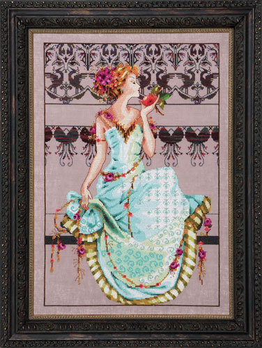 PersephoneMirabilia Persephone kit: Like the lotus flowers behind her, with their blooms growing up from the darkness, Persephone emerges from the underworld once a year to return to her mother Demeter and herald the beginning of spring. Surrounded by cranes, symbols of happiness, good fortune, and longevity, she embraces the beauty of the Victorian era in her aquamarine gown while she contemplates the luscious pomegranate and the coming harvest.