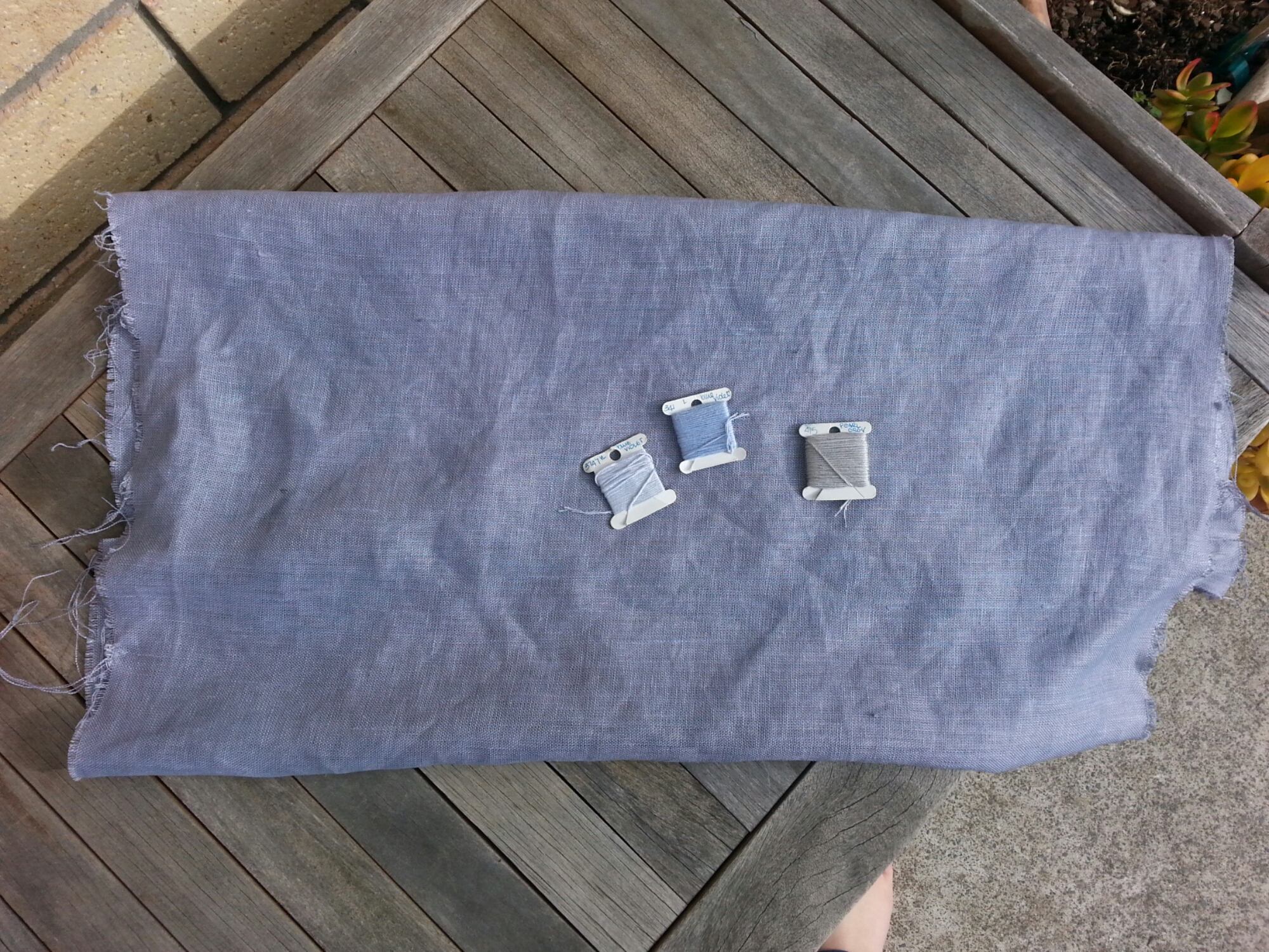 I picked up some plain white 32ct linen from Spotlight – they had it marked at $13.99 pm rather than per 10cm! – cut off a section and paired it with Dylon Elephant Gray. Which is clearly not that gray.