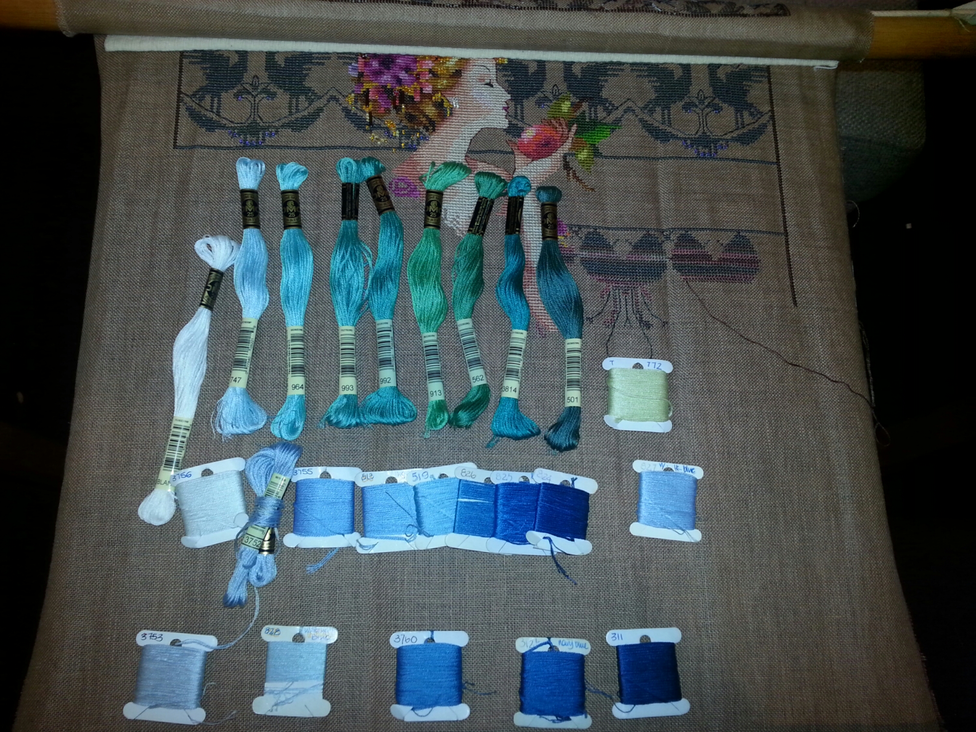 On the stitching side, I’m going with my thoughts of changing out Persephone’s dress. I’m not an aqua/teal person, I’ll have to change out the brown bugles (oh darn) but here’s my initial floss toss.