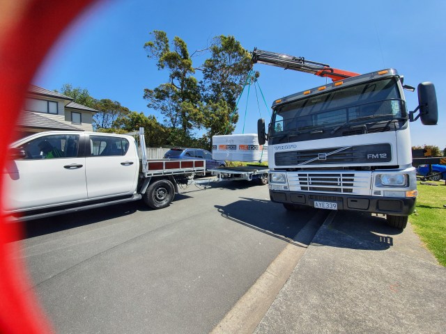We’ve been madly digging, shifting builders mix, compacting, building retaining walls, painting, more digging, lots of concrete and we’re nearly there. Monday saw a huge leap forward, with the pool delivered….
