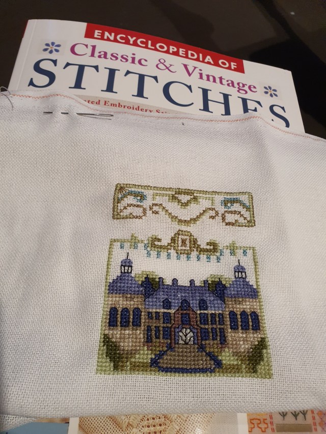 Hello everyone! This weeks been a bit slow, apart from Saturday progress on my new start, Chatelaine Design mini castle I #071. That new start buzz got me thru most of the first two sections quite quickly, even tho I’ve not stitched on it today. Today I’ve mostly napped! Doctors visit tomorrow, when I expect to be told it’s the flu & to rest & get fluids. After all, that was Mase a week or so ago…