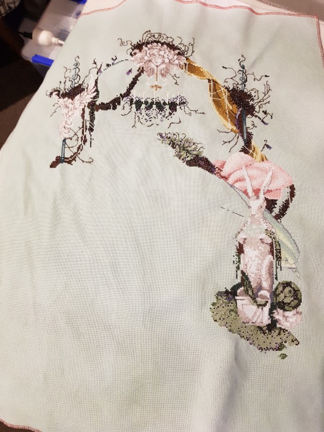 And while the next RR piece arrived mid-month, I didn’t start it. I have until mid-April, so it will now become my home piece until completed. I carried on the focus on Fairy Idyll (she even came to Wellington & road tripping with us) and I got the RHS wing, topiary (less the Kreinik strands) and bunny completed. I even got some of the grass done along the base and am in a pretty good space to continue after the RR witch.
