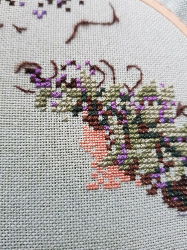 Yep. March came in and stole my stitchy bug. The weave on the RR piece is very tight (32ct opalescent that was then dyed) and I am not enjoying my progress. I have to wear the reading glasses and work short stints, or my head aches. And bc my reading glasses are so focussed, I can’t do my usual and stitch along to Flosstube, as I can’t even focus on the (very large) TV across the room. It’s going to be a daylight only, headphones on, gripping audiobook to get me to the finish line here. I managed maybe 5-6 thread lengths yesterday. Or the skirt train bit, if you’re more visual.