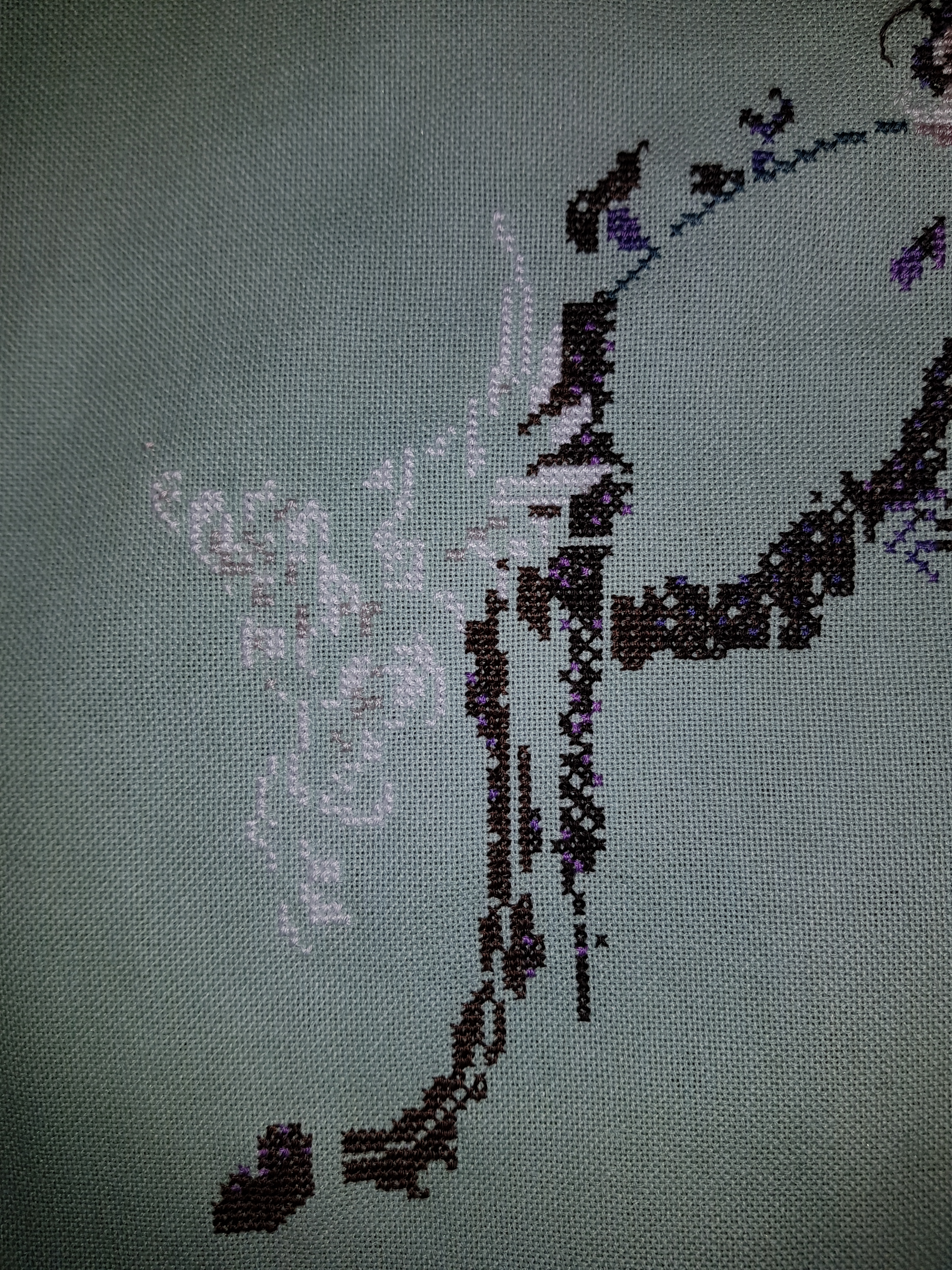 Yep. March came in and stole my stitchy bug. The weave on the RR piece is very tight (32ct opalescent that was then dyed) and I am not enjoying my progress. I have to wear the reading glasses and work short stints, or my head aches. And bc my reading glasses are so focussed, I can’t do my usual and stitch along to Flosstube, as I can’t even focus on the (very large) TV across the room. It’s going to be a daylight only, headphones on, gripping audiobook to get me to the finish line here. I managed maybe 5-6 thread lengths yesterday. Or the skirt train bit, if you’re more visual.