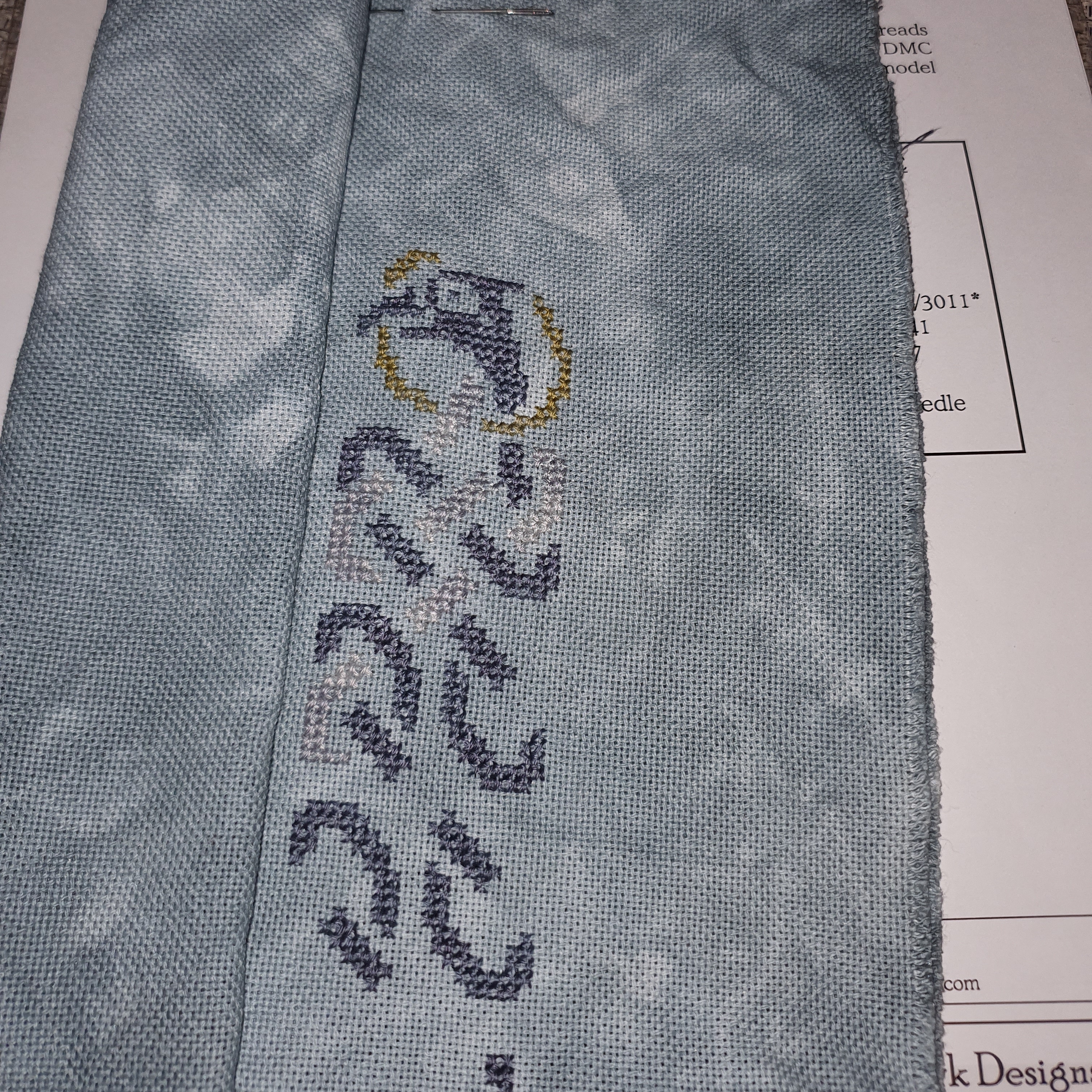 Achieved! Last night (Feb 28th) I put the last few stitches into Bethlehem (for the SM “Christmas All Year Round” SAL). It’s on Silkweaver 28ct Goldspinner Opalescent Lugana as I imagined the Star to have illuminated the stable & surroundings as it says in Luke 2:9 “Suddenly, an angel of the LORD appeared among them, and the radiance of the LORD’s glory surrounded them…” I made some changes; the flowers didn’t fit my viewpoint, so they were gone; the smaller stars got lost in the opalescent, so they are gone; and the crow is now a dove (eggshell plus DMC 168). I’ve just realised I forgot to initial it – doh.