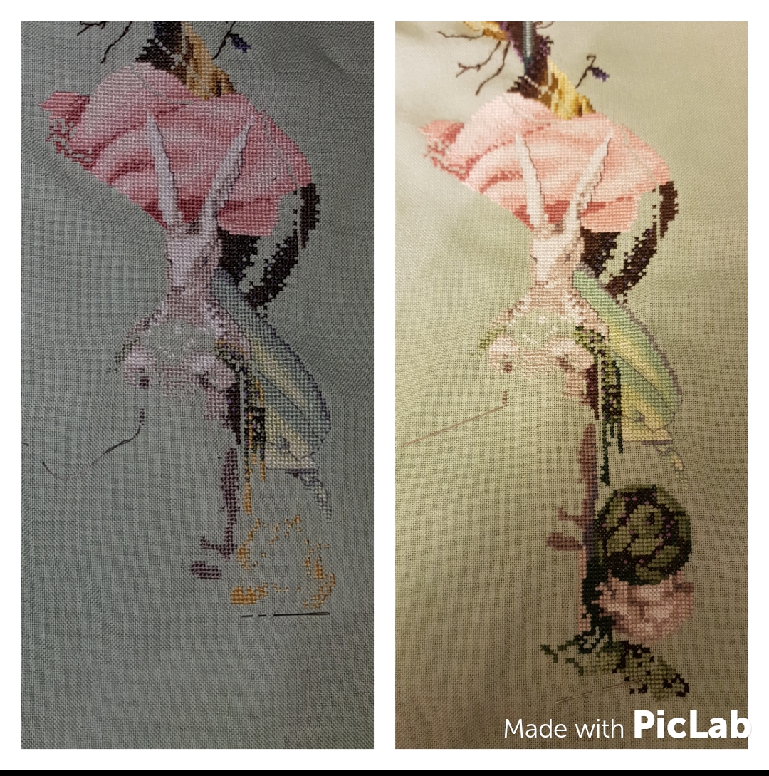 Yep. March came in and stole my stitchy bug. The weave on the RR piece is very tight (32ct opalescent that was then dyed) and I am not enjoying my progress. I have to wear the reading glasses and work short stints, or my head aches. And bc my reading glasses are so focussed, I can’t do my usual and stitch along to Flosstube, as I can’t even focus on the (very large) TV across the room. It’s going to be a daylight only, headphones on, gripping audiobook to get me to the finish line here. I managed maybe 5-6 thread lengths yesterday. Or the skirt train bit, if you’re more visual.