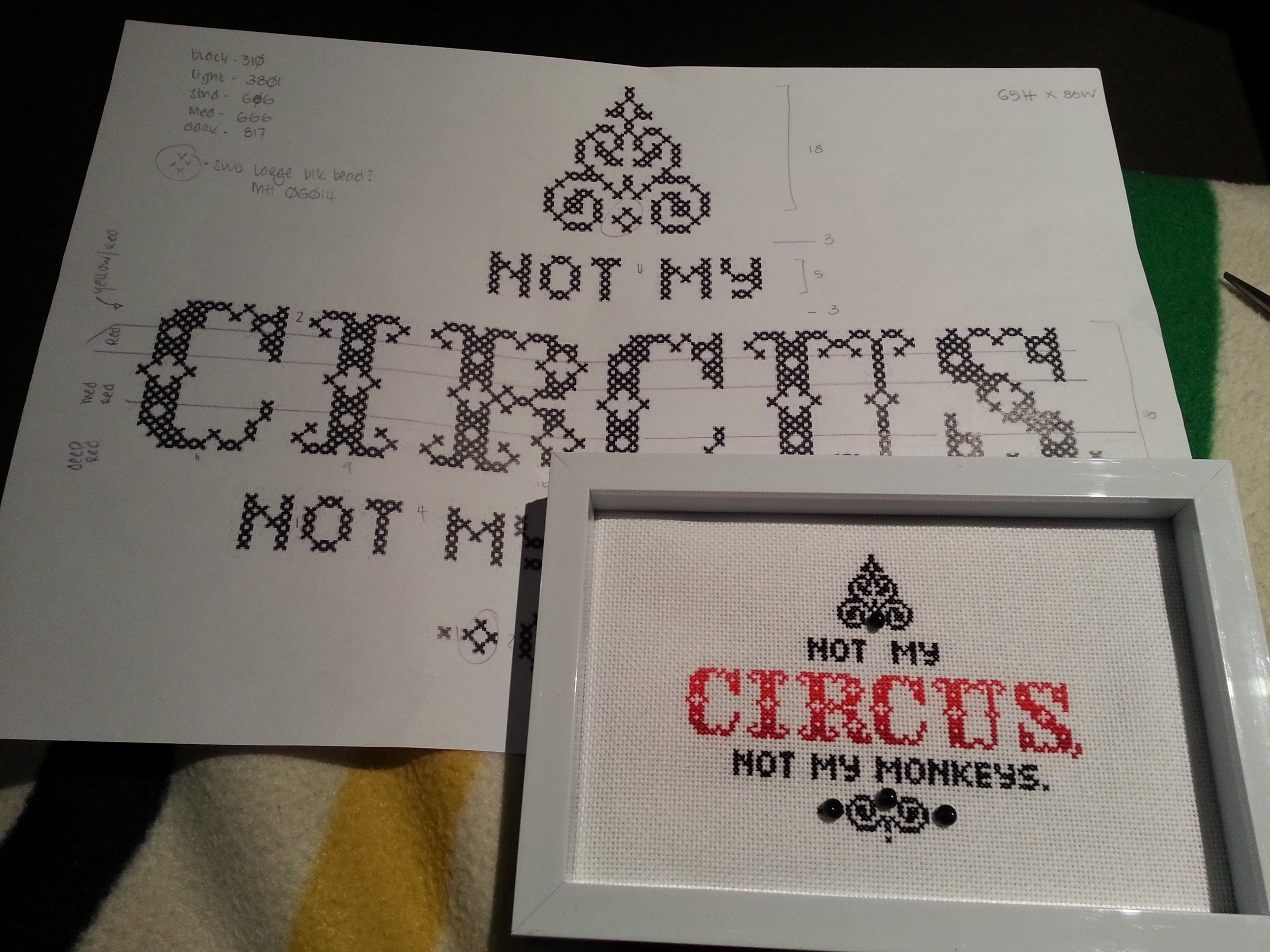 Second was a colour conversion of Not My Circus, which is on my filing cabinet here at work. It isn’t properly laced as I am looking for that perfect Monkey or Circus button or brad to add to it but it serves the purpose as a reminder not to get caught up with other people’s dramas here at work, no matter how entertaining they might be. If you want a copy of my stitching notes, including colours, please flick me an email at paulainauckland at gmail dot com & I’ll get it out to you. I’m really happy with the tones that progress down the word Circus. REALLY happy.