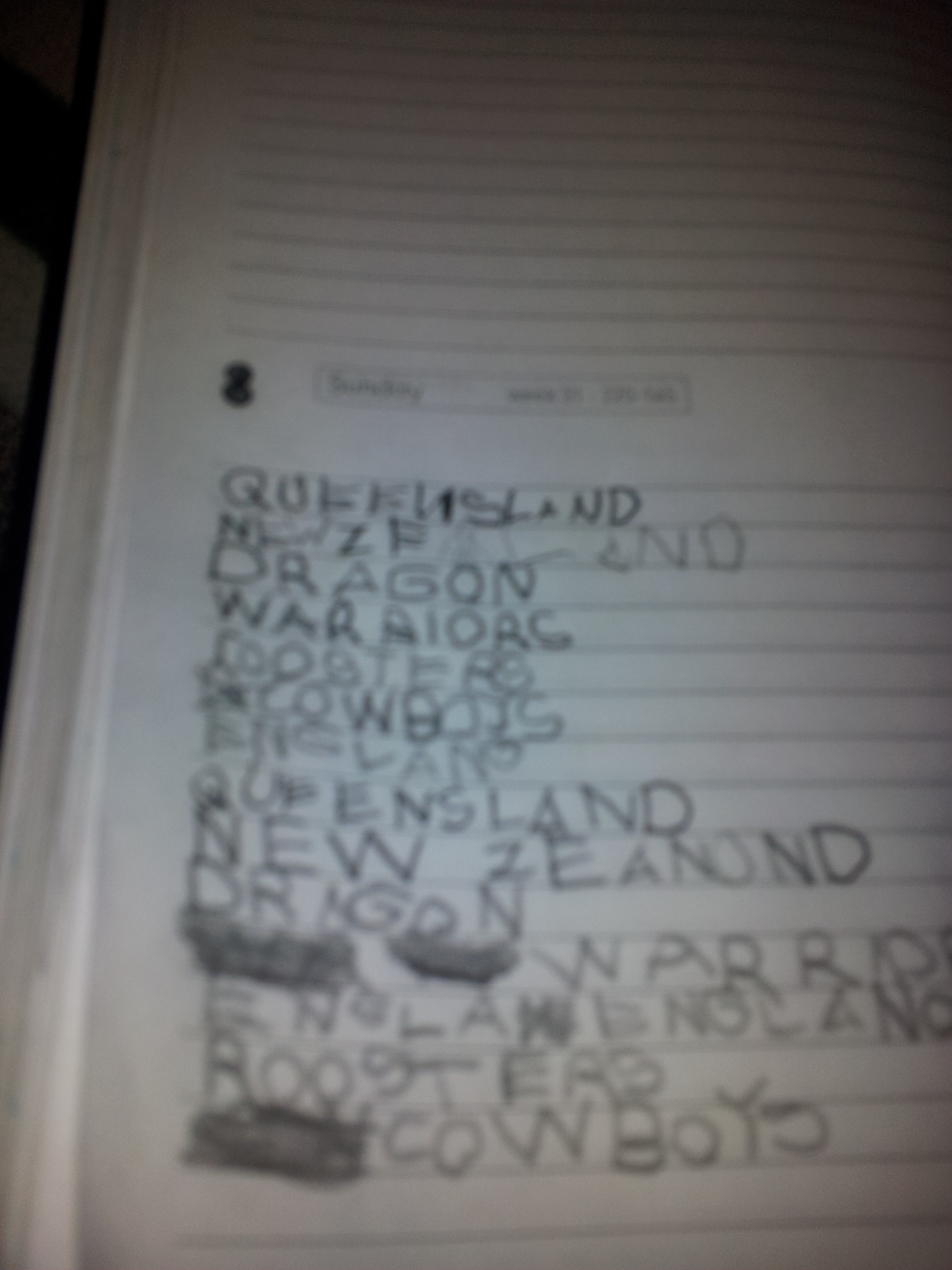 Mase has been practicing his writing; there will be tears when he starts school next term and is told that he can’t write everything in block letters. At least he didn’t include New South Wales in his list of favourite teams, but where are my Bunnies?! Time for bed, little man.